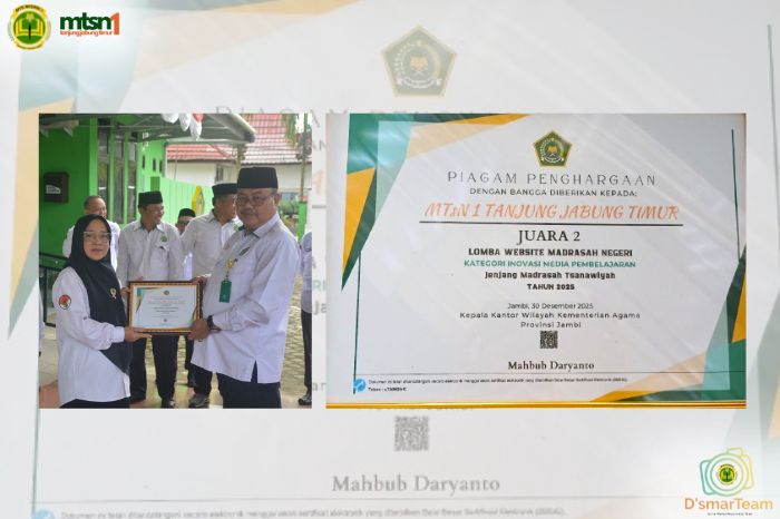 MTsNegeri 1 Tanjung Jabung Timur berhasil meraih Juara 2 dalam Lomba Website Madrasah Negeri Tahun 2025. Penghargaan ini diberikan untuk kategori Inovasi Media Pembelajaran pada jenjang Madrasah Tsanawiyah. Kompetisi tersebut...